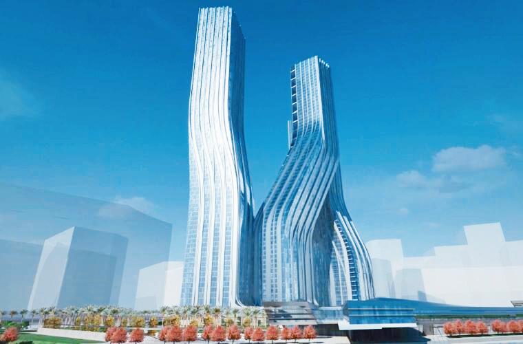 “舞蹈大廈”的建筑設(shè)計(jì)利用了舞蹈動(dòng)作的流動(dòng)性的概念,將三座建筑融合成為一個(gè)整體。三座樓宇共享一個(gè)基座,兩兩連接起來,在第7層,寫字樓和酒店這座塔樓和另一座連接起來,三座融合在一起,共同享有一個(gè)全景餐廳。它們從地面彎曲向上,到高空相互交織,創(chuàng)造出流體動(dòng)畫般的美感。