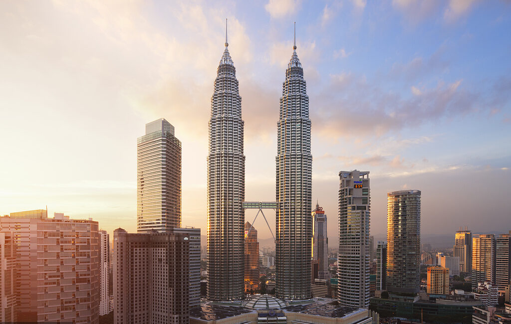 吉隆坡石油雙塔位于吉隆坡市中心,高452米,共地上88層,一對(duì)一模一樣的大廈并肩聳立,中間棧橋相連,設(shè)計(jì)靈感來自于伊斯蘭教教義。雙子塔是吉隆坡的標(biāo)志性城市景觀之一,是世界上最高的雙子樓和第五高的建筑物,也是著名好萊塢動(dòng)作大片《偷天陷阱》的拍攝場地,片中男女主角肖恩和凱瑟琳從雙子塔逃脫片段,可謂是震驚了世人。