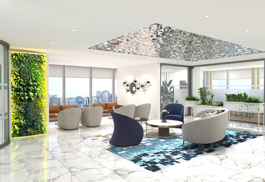 空間布局:強調(diào)功能性分區(qū),如獨立的客戶接待區(qū)、VIP洽談室、辦公區(qū)等,確保私密性和高效性;接待室通常采用隔音材料(如吸音板、軟包墻面)打造安靜的洽談環(huán)境,體現(xiàn)對客戶隱私的重視;前廳設(shè)計注重大氣感,可通過造型燈帶、格柵天花等元素營造通透感,搭配大理石前臺和金屬裝飾,提升整體質(zhì)感。
